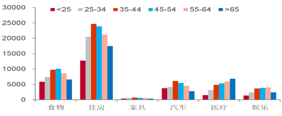 不同年龄段消费结构特点:老龄人偏好服务,劳动年龄人口偏好耐用品。
