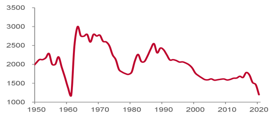 我国总人口到 2020 年约为 14.12 亿,并将在 2025年左右达到高峰,峰值约为 14.22 亿。此后一路下滑,到 2037 年下降至14 亿以下,到 2050 年约为 13.13 亿。