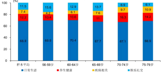 随年龄增长老年人养生、医疗等支出占比上升,日常生活占比相对稳定,娱乐社交仍占一定比重。