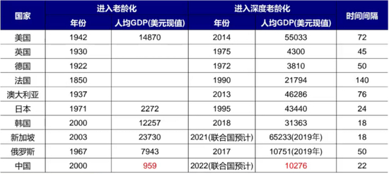 同发达经济体相似阶段比较,我国未富先老特征突出;我国于2000年进入老龄化社会,人均GDP为959美元;