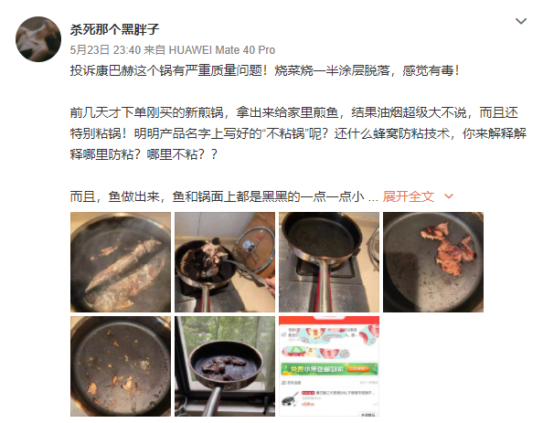 5月23日,微博昵称“杀死那个黑胖子”的网友爆料自己购买的康巴赫不粘锅有严重质量问题,表示自己刚购买的康巴赫锅子在煎鱼时出现了大量油烟,同时还发生了严重的粘锅和涂层脱落现象。