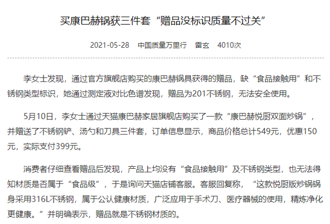 5月28日,中国质量万里行报道了一起赠品维权事件,主人公之一就是康巴赫。报道显示,李女士在购买了“康巴赫悦厨双面炒锅”后获赠了不锈钢铲、汤勺以及刀具三件套,但她并未在赠品上看到“食品接触用”和不锈钢类型。