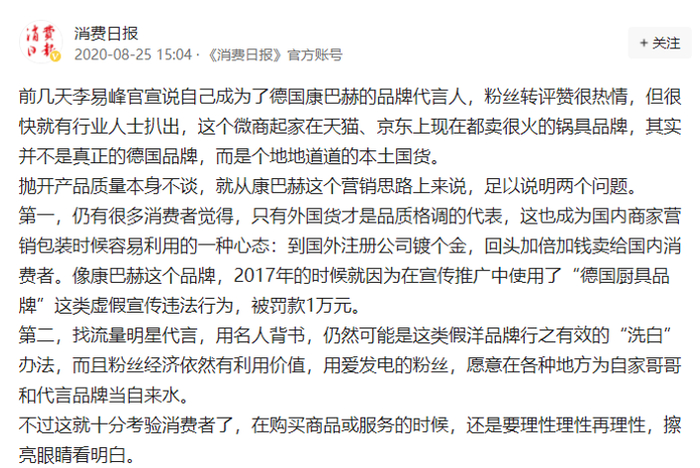 2020年8月25日,《消费日报》发文批评康巴赫虚假宣传行为,并呼吁消费者保持理性。