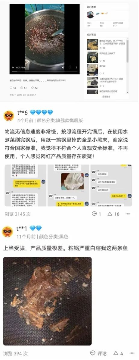 但事实上,消费者对于康巴赫不粘锅品质的质疑,从康巴赫诞生之初就已存在,在微博、小红书、淘宝等平台上,都能看到大量对康巴赫产品的差评。只是这些差评之前都被掩盖在了康巴赫的“网红”光环之下。