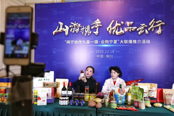 |闽宁禾美电商扶贫车间负责人徐美佳(左)和“巧媳妇”直播团队主播马燕在拼多多直播间推介宁夏特产。(摄影:小安)