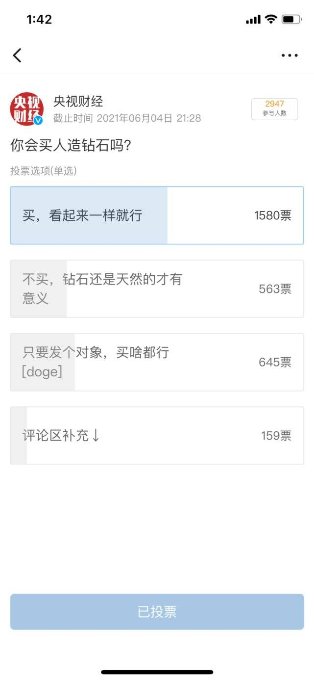 央视财经于5月28日发起了主题为“你会买人造钻石吗?”的微博投票。到截稿日为止(6月4日),已有近3000人参与,其中50%的投票者选择了“买,看起来一样就行”,20%的投票者选择了“不买,钻石还是天然的才有意义”。