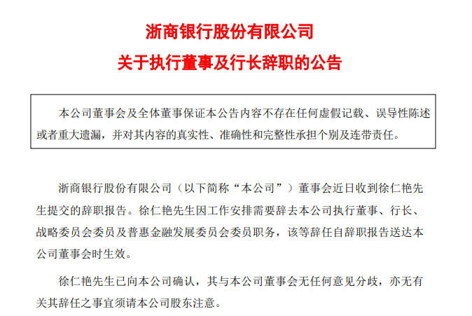 公告显示,徐仁艳因工作安排需要辞去浙商银行执行董事、行长、战略委员会委员及普惠金融发展委员会委员职务,此外,副行长徐蔓萱辞职,刘贵山因工作安排需要辞去浙商银行副行长及首席风险官职务,该等辞任自辞职报告送达该行董事会时生效。