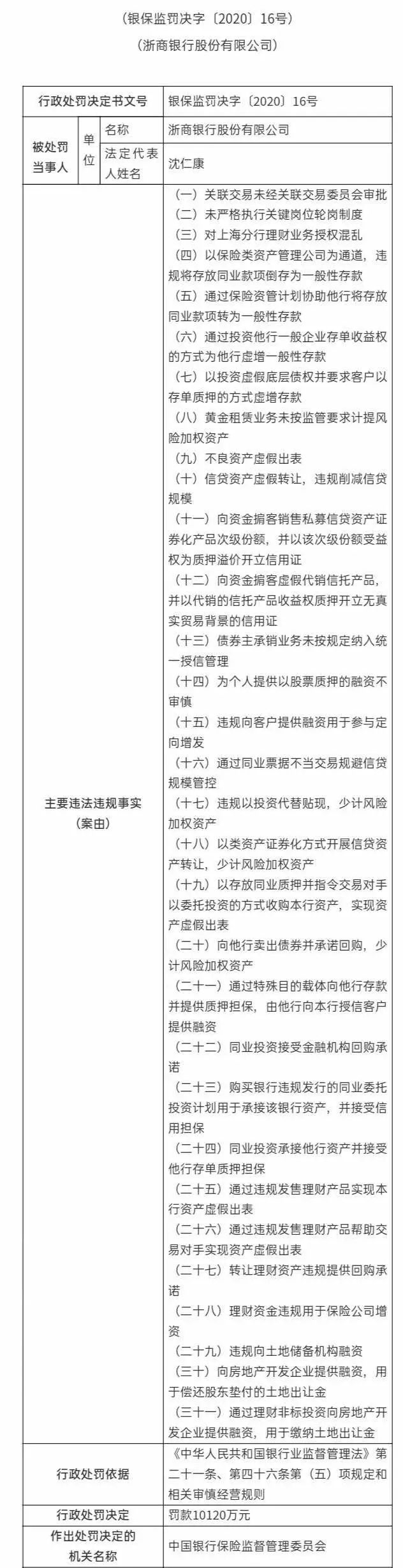2020年11月,银保监会对浙商银行开出亿元罚单,根据公告,涉“31宗罪”。具体来看,浙商银行的31宗违法违规事实为: