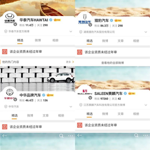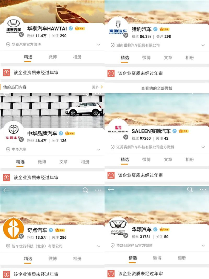 近日,《道哥说车》编辑注意到,华泰汽车、猎豹汽车、中华品牌汽车、华颂汽车等传统车企以及赛麟汽车、奇点汽车等造车新势力的官方微博均停更已久,且出现了“企业资质未经过年审”的标识,头像“V”字标识也已经变成了灰色。据了解,“资质未经过年审”就是在年审时限内没有重新递交资料,进行资质审核。