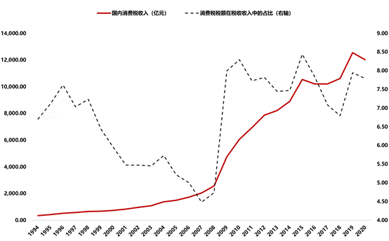 图表3 消费税收入表现及在税收收入中的占比
