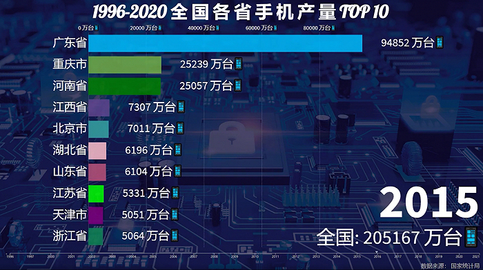 时间来到2014年,我们可以看到河南和重庆的手机产量增长迅速,先后超越北京成为第二、第三,两个省份在2015年产能均超过了2亿台。