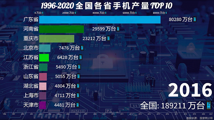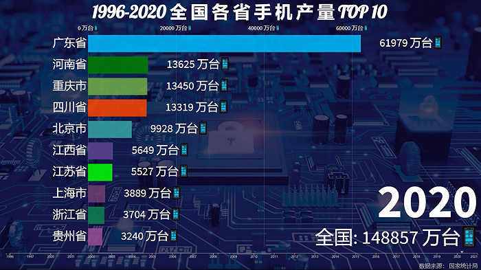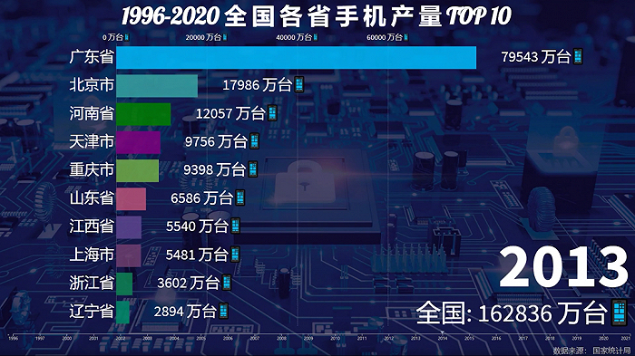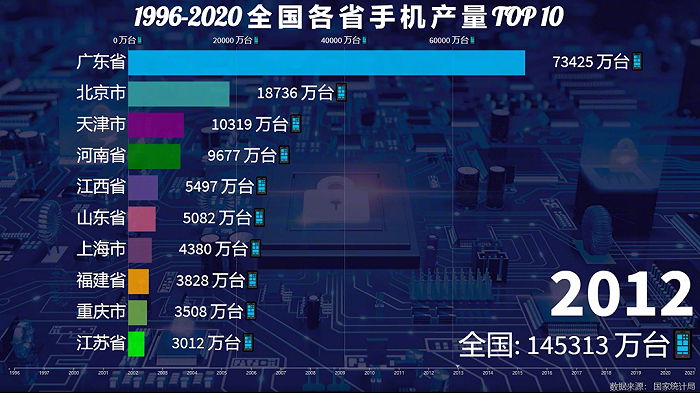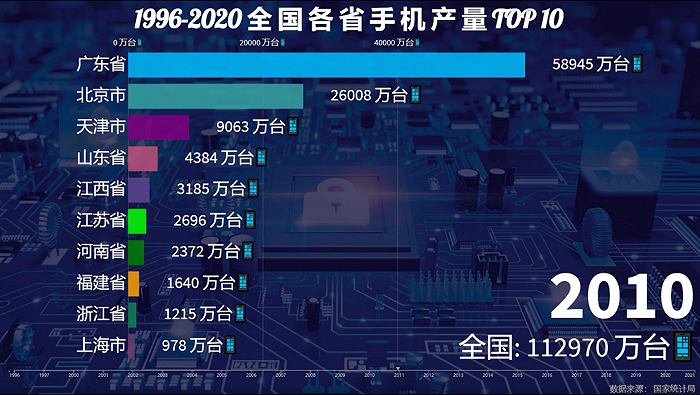 2005年,全国整体手机产量达到4.7亿台,2006年北京扩大领先优势,产能来到2.2亿台,广东反超天津位列第二,全国总产量约5.5亿台。