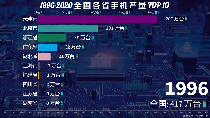 1996年,天津大幅领先其他省份,手机产量超过200万台。这一年,摩托罗拉在天津的手机工厂还在开足马力生产。