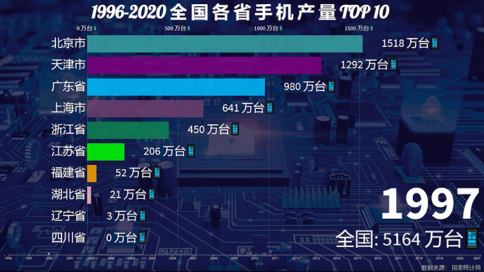 从1996年到1997年底,短短一年,中国手机产量从400多万部暴涨至5000万部,翻了将近13倍,以北京、天津、广东、上海、浙江、江苏为代表的省份甚至都有几十倍的产量增长。