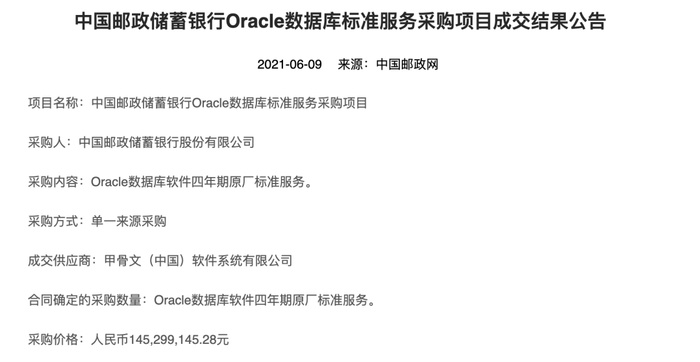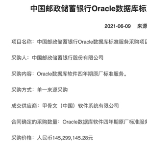 2021年3月23日,中国邮政储蓄银行Oracle数据库标准服务采购项目单一来源采购前公示发布,采购内容为Oracle数据库软件四年期原厂标准服务。