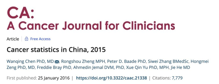 [1] Chen W, Zheng R, Baade PD, Zhang S, Zeng H, Bray F, Jemal A, Yu XQ, He J. Cancer statistics in China, 2015. CA Cancer J Clin. 2016 Mar-Apr;66(2):115-32. doi: 10.3322/caac.21338. Epub 2016 Jan 25. PMID: 26808342.