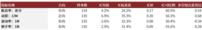 技术分析类的指标尝试从市场交易特征的角度抽取有预测能力的信息。我们在此纳入主流的量价类指标测试:价格动量:12M,波动率:1M,换手率:1M,股息率。