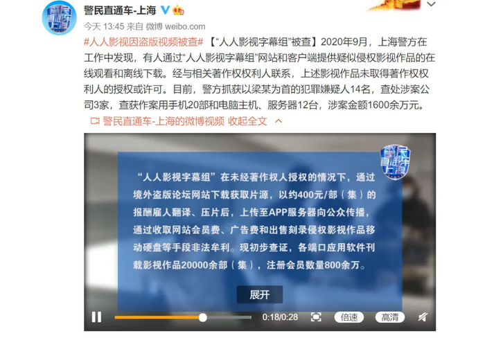 “独立性非商业组织”人人影视字幕组,却黯然走向退场。2021年2月3日,人人影视字幕组因“侵犯影视作品著作权”被查封。有分析认为,人人影视二次压制、发布视频作品,是严重侵权行为。
