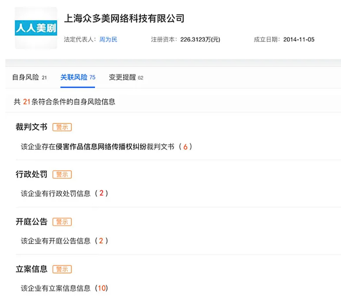 人人视频与腾讯、爱奇艺、B站等国内多家平台企业均发生过版权纠纷。企查查数据显示,人人视频隶属的上海众多美网络科技有限公司,相关11条判决文书记录案由均为侵害作品信息网络传播权纠纷。