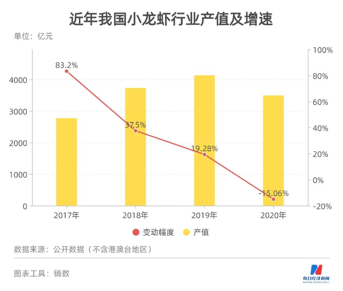 一个不可否认的事实是,2020年的小龙虾产业就已经出现降温:全年中国小龙虾产业总产值3490.7亿元,同比下降15.06%。