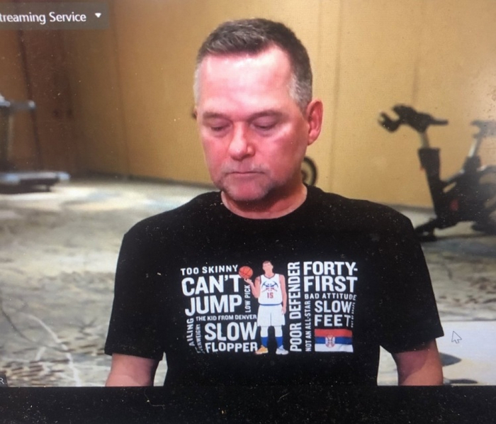 在约基奇拿下MVP后,恩师马龙接受采访时特意换上了一件定制T恤。