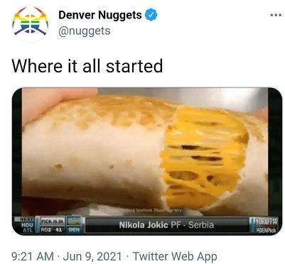 当约基奇被选中时,电视里播放的不是现场画面,而是一款卷饼的广告。