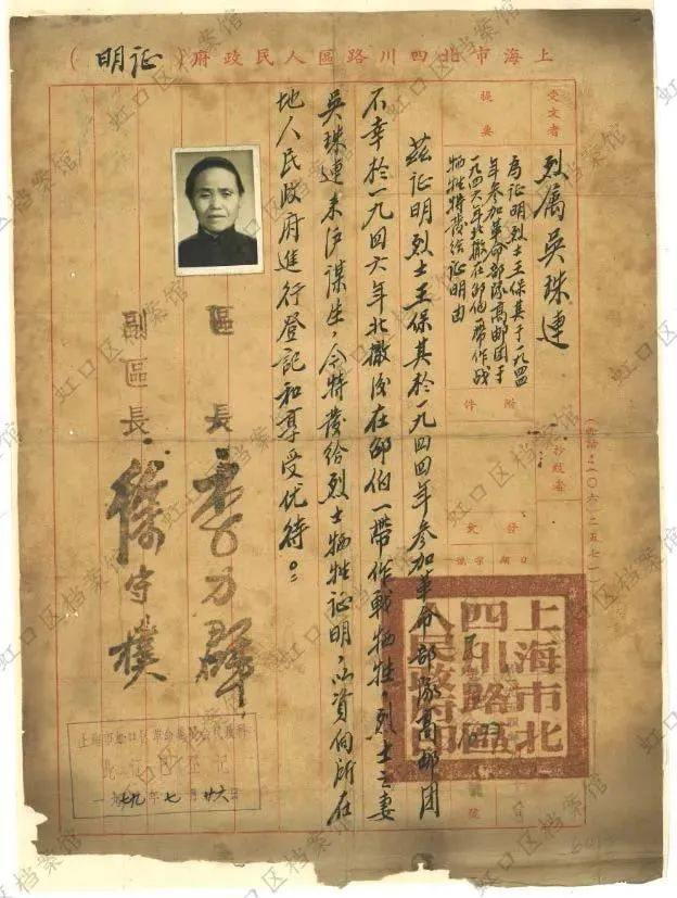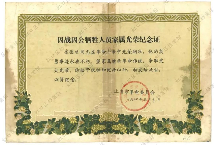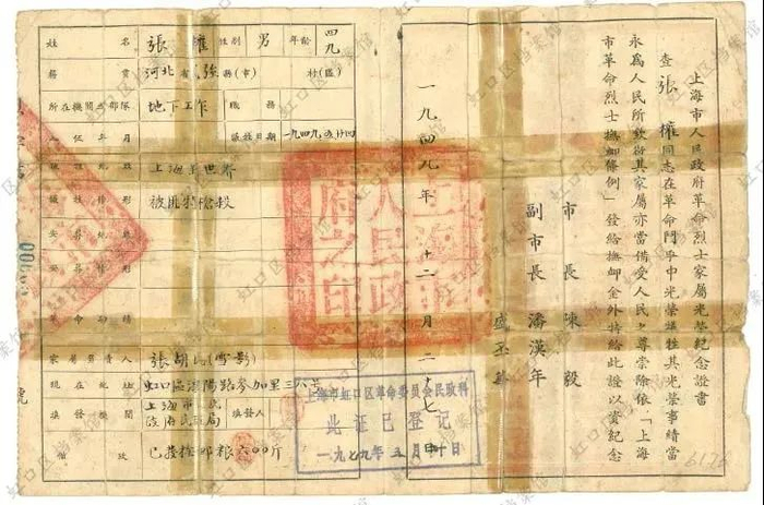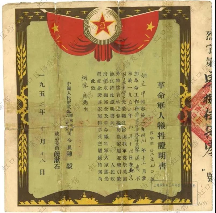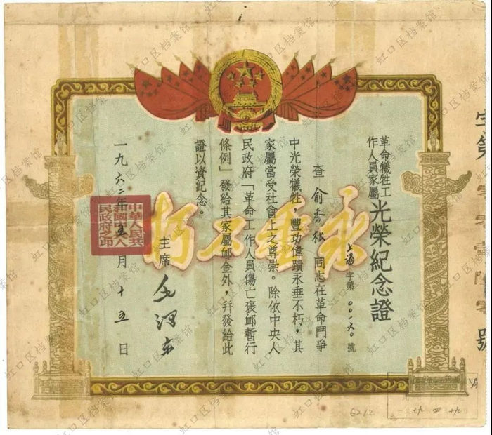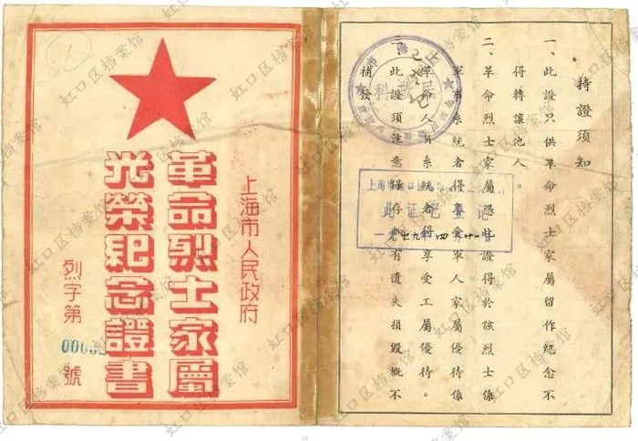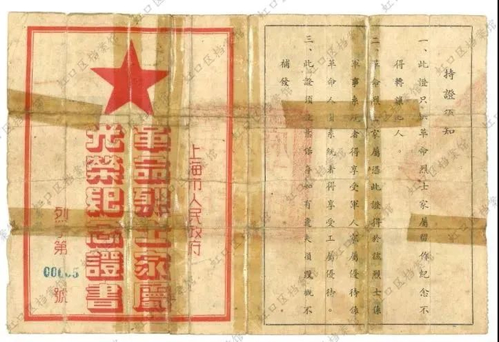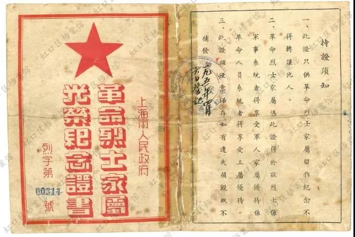 后来,随着相关工作的逐步规范,民政部对革命烈士证进行了统一换发。当时,根据要求,由区民政局落实了换发工作。虹口因文化底蕴深厚、红色资源丰富,当时换发的烈士证就达200余件。作为珍贵的红色记忆资料,这些被换下的老款烈士证一直珍藏在虹口区档案馆中。