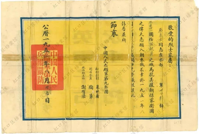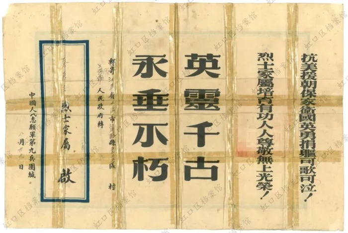 此次虹口区档案馆将这批证书向社会公布,旨在让公众多角度了解革命烈士的生平事迹,从这些烈士证明的红色珍档中,追忆牺牲烈士的光荣事迹,牢记先烈们未尽的事业,庚续共产党人为人民服务的精神,传承红色基因。
