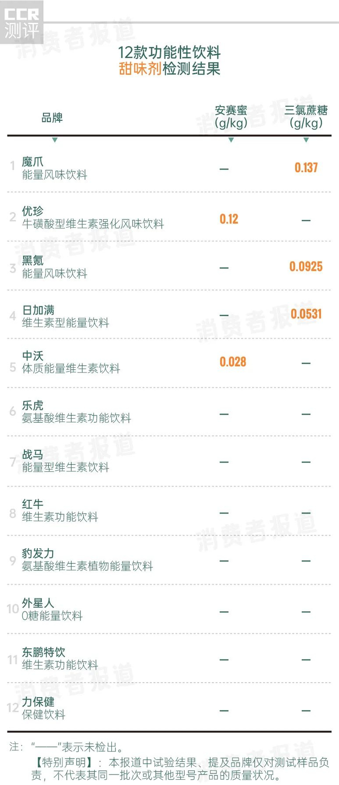 从上述检出结果看,5款功能性饮料中安赛蜜或三氯蔗糖的添加量均符合《GB2760-2014 食品添加剂使用标准》的规定。
