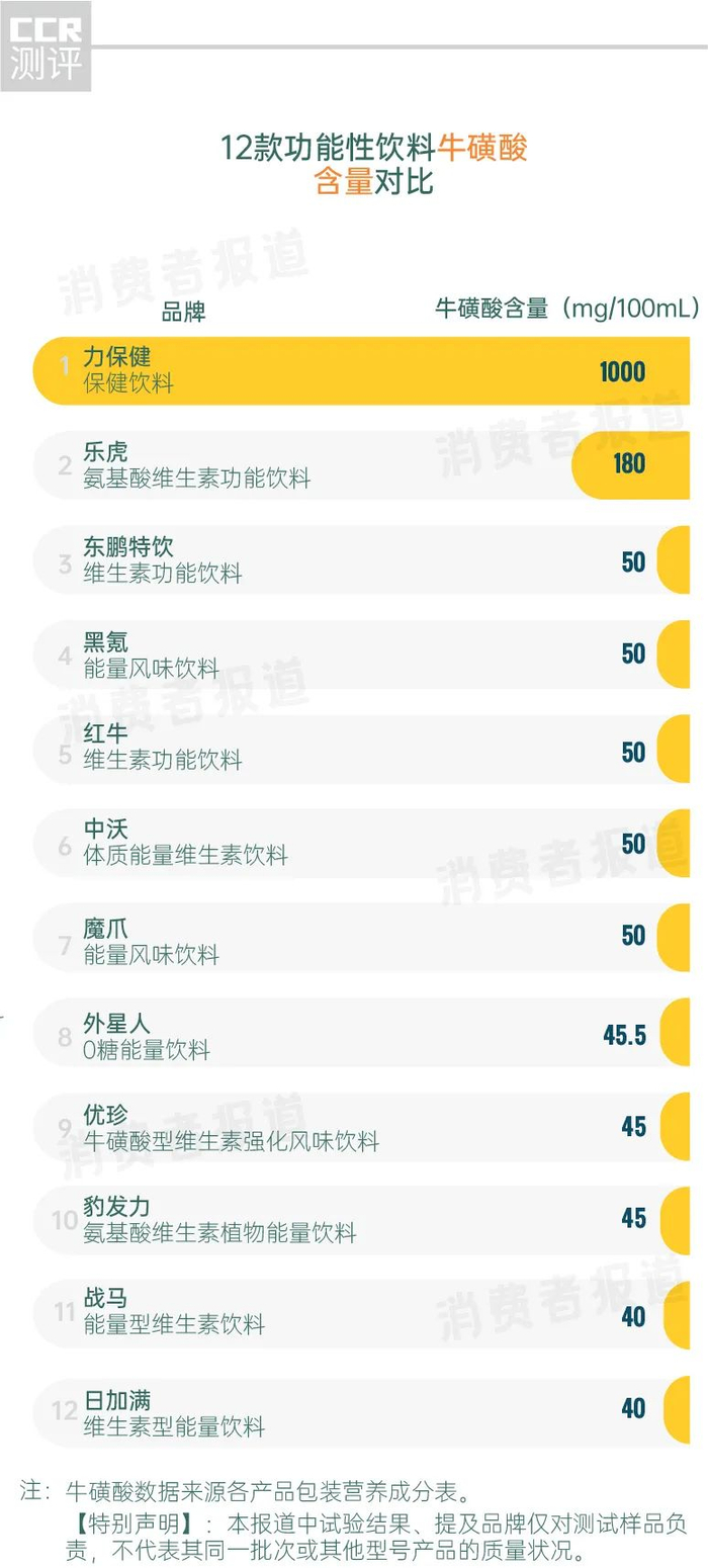 测试结果显示,12款功能性饮料的牛磺酸含量在40mg/mL~1000mg/mL之间,其中,战马和日加满均为40mg/100mL,力保健高达1000mg/100mL,它们的差距高达25倍。