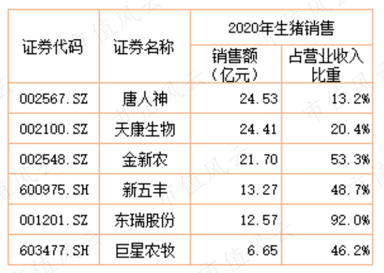 2020年的生猪出栏量由高到低依次是天康生物、唐人神、金新农、东瑞股份、新五丰、巨星农牧。
