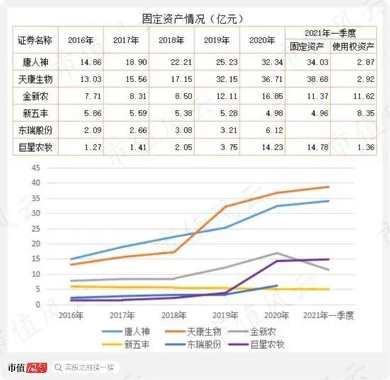 6家公司中固定资产规模较小的是新五丰和东瑞股份,巧合的是两家都是供港澳的生猪养殖企业。其中新五丰的固定资产最近五年无明显变动,但其新增使用权资产8.4亿元,是固定资产的1.6倍;东瑞股份上市募资后,正处于扩产阶段,固定资产在未来两三年将不断增加。