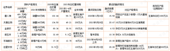 (注:①新五丰为2021年1-3月的产量数据,②③巨星农牧为2020年7-12月数据,上表数据综合上市公司年报与日常公告、机构调研信息、上市公司官网数据)