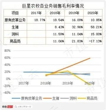 从毛利率看,原有皮革业务的毛利率逐年下滑。受“猪周期”影响,巨星农牧的生猪业务销售毛利率增长非常快,2020年达58%;饲料毛利率相对稳定,2020年15%;商品鸡在2020年出现亏损,营业收入为0.86亿元,但运营成本为1.01亿元,导致毛利率为-17%。