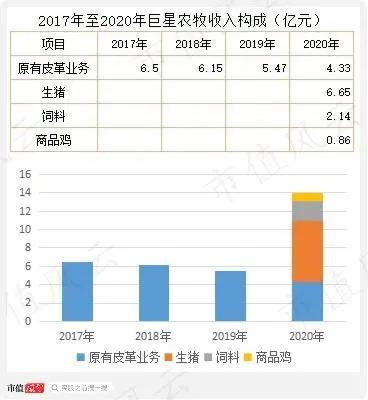 上市公司原油皮革业务逐年下滑,2020年收购巨星有限后,生猪养殖成为第一大业务,接近6.7亿元。