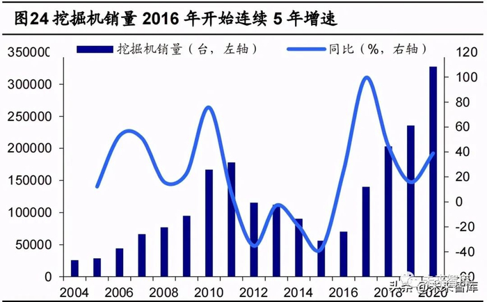 本轮挖机复苏周期已持续 5 年,2020 年销量较 2015 年提高 5.81 倍。对比工程机 械,挖掘机销量复苏周期已经持续 5 年(2016-2020 年),2020 年挖掘机销量为 327605 台,是 2015 年的 56349 台的 5.81 倍,2015-2020 年 CAGR 达到 42.20%,无论从复 苏时间还是弹性看,本轮工程机械上行周期都是历史最强的。