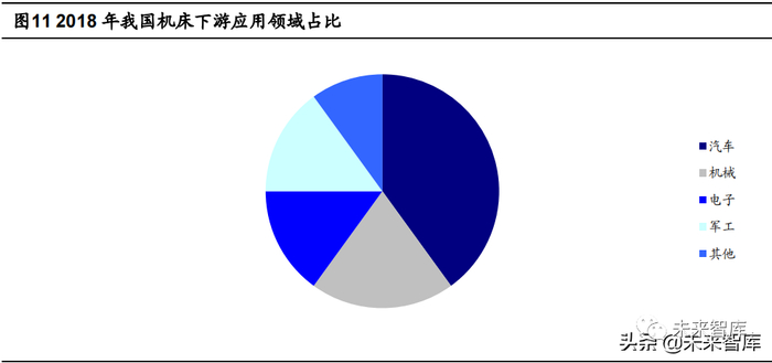 汽车、机械、电子、军工是我国机床最主要的下游应用领域。机床是制造业的基础 装备,广泛应用于各种类型的制造业。根据立鼎产业研究网,我国机床的下游应用领域 中,2018 年汽车/机械/电子/军工分别占比约为 40%/20%/15%/15%,是最主要的下游 应用领域。