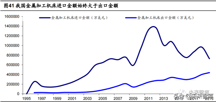 我国高端机床大量依赖进口,出口主要以中低端为主。以金属加工机床为例,我国 金属加工机床进口金额始终大于出口金额,2019 年进口/出口金额分别为 72.75/43.96 亿元,我国金属加工机床进口/出口数量分别为 5.54/943.18 万台、进口/出口单价分别 为 131321.41/466.13 美元/台,2019 年我国金属加工机床出口数量 170 倍于进口数量, 但出口单价仅为进口单价的 0.35%。