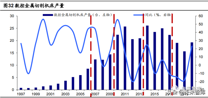 数控机床周期:我国数控机床周期约为 3-4 年。以金属切削机床为例,我们对数控 机床周期进行探究,我们以数控机床产量跳变的年份作为周期的开始,发现 2007 年后 我国机床行业经历 4 轮周期,周期间隔约为 3-4 年。