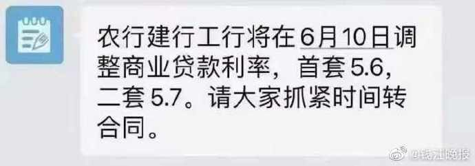 6月9日消息,“农行建行工行将在6月10日调整商业贷款利率,首套5.6%,二套5.7%。请大家抓紧时间签合同。”昨天上午,微信朋友圈里,有不少中介经纪人都转发了这样一条信息。