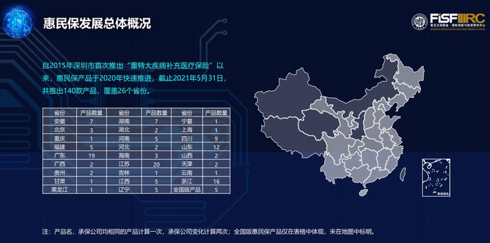自2015年深圳市首次推出“重特大疾病补充医疗保险”以来,惠民保产品于2020年快速推进,截止2021年5月31日,全国共推出140款惠民保产品,覆盖26个省份。综合各地区经济发展水平和保险发展水平来看,惠民保产品数量与各地区经济发展程度、保费收入水平基本呈正相关,但与各地区保险深度、保险密度无明显相关性。