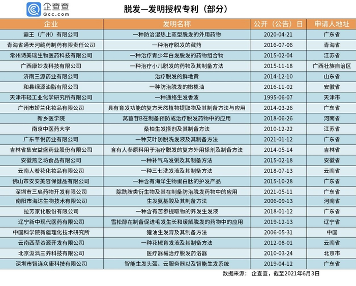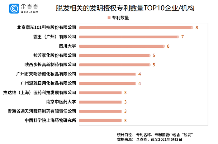 此外,脱发发明授权专利数量排前十的企业/机构还有拉芳、步长制药、天吻娇颜、广州温雅等知名企业。