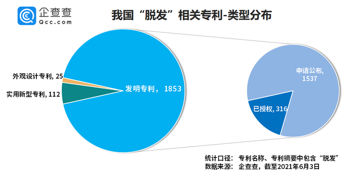 数据显示,从“脱发”相关专利的类型来看,发明专利数量最多,共1853条,占比93%。其次是实用新型专利,共有112条,最少的是外观设计专利,仅有25条。