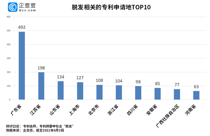 据国家卫健委数据统计,我国有超2.5亿人脱发,平均每6人当中就有1人饱受脱发困扰。由于脱发严重影响颜值,促使“脱发经济”成为新风口,各种防脱产品琳琅满目,养发护理、生发机构、假发生产等行业日益蓬勃发展。企查查数据显示,目前我国共有1005家植发相关企业,从地区分布来看,广东、贵州、河南分别以162家、87家、84家位列前三。