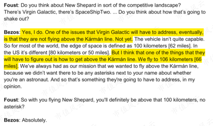 贝佐斯接受《太空新闻》采访时称:“维珍银河最终必须解决的一个问题是,他们目前还没有飞越卡门线,其太空船的性能不是很好……但我认为他们必须解决的问题之一就是如何到达卡门线以上。我们(蓝色起源)飞到了106公里。”