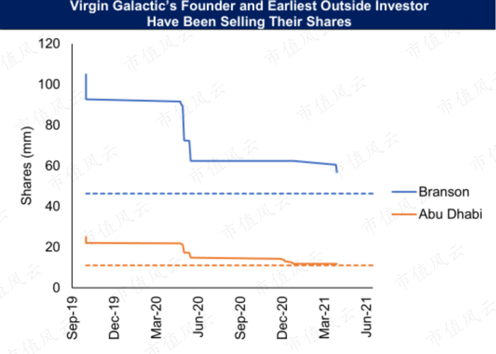 由于禁售期,原有股东在禁售期满前(截至2021年10月)不能出售超过其一半持股。下图虚线分别表示布兰森(蓝色虚线)和Abu Dhabi(橙色虚线)仍受禁售限制的股票数量。