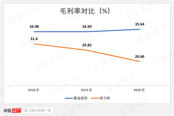 公司的毛利率连续三年稳定在35%附近,而同行业的哈尔斯的毛利率从31.6%下滑至26.66%,2020年,与嘉益股份相差近9个百分点。
