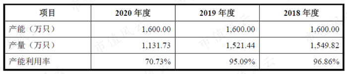 公司的产能约为1,600万只,2018年至2020年的产量分别为1,549.82万、1,521.44万和1,131.73万只,产能利用率分别为96.86%、95.09%和70.73%。
