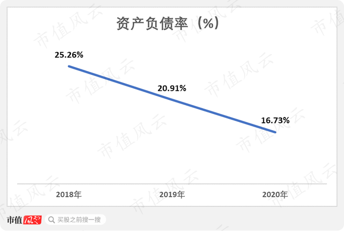 嘉益股份的资产负债率从2018年的25.26%下降至2020年的16.73%,债务比例较低。
