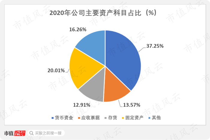 从资产负债表看,公司前五大科目依次分别为货币资金(37.25%)、固定资产(20%)、应收票据(13.57%)、存货(12.91%)和无形资产(11.58%)。